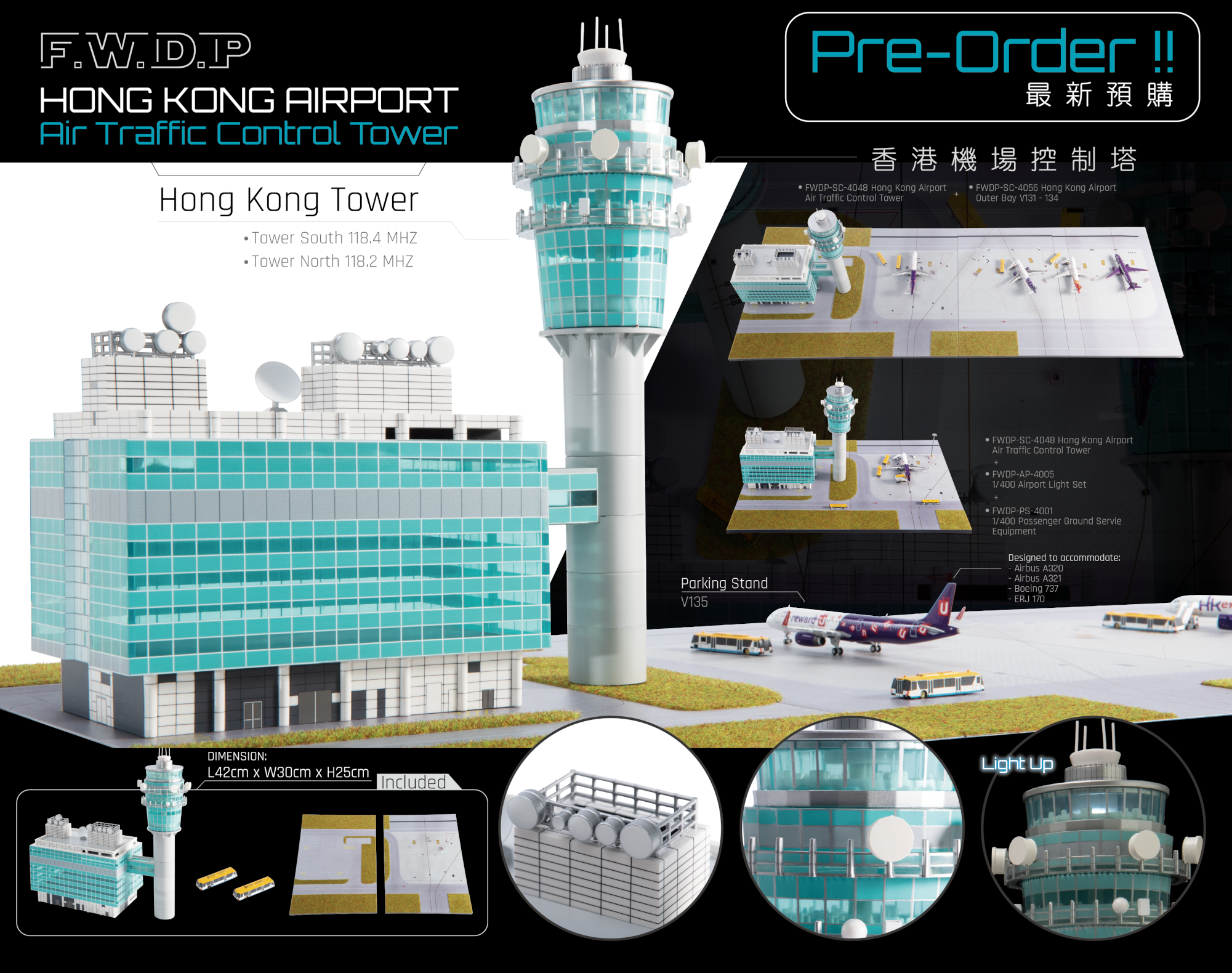 Kontrolltårnet kommer ferdig bygget. Det følger også med to flyplassbusser og to plater som vist på bildene. Det følger ikke med flymodeller.