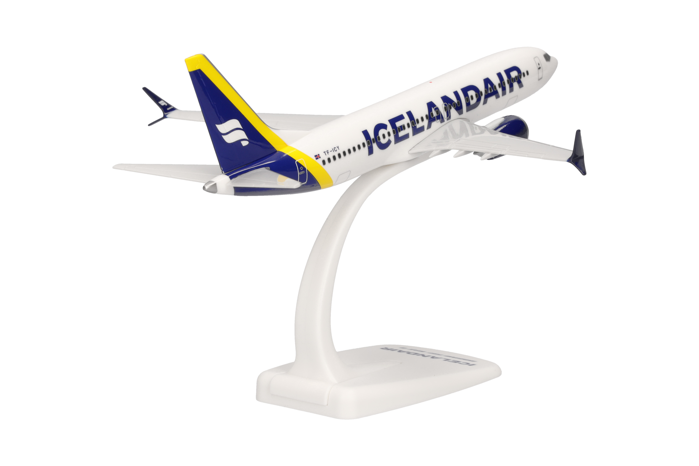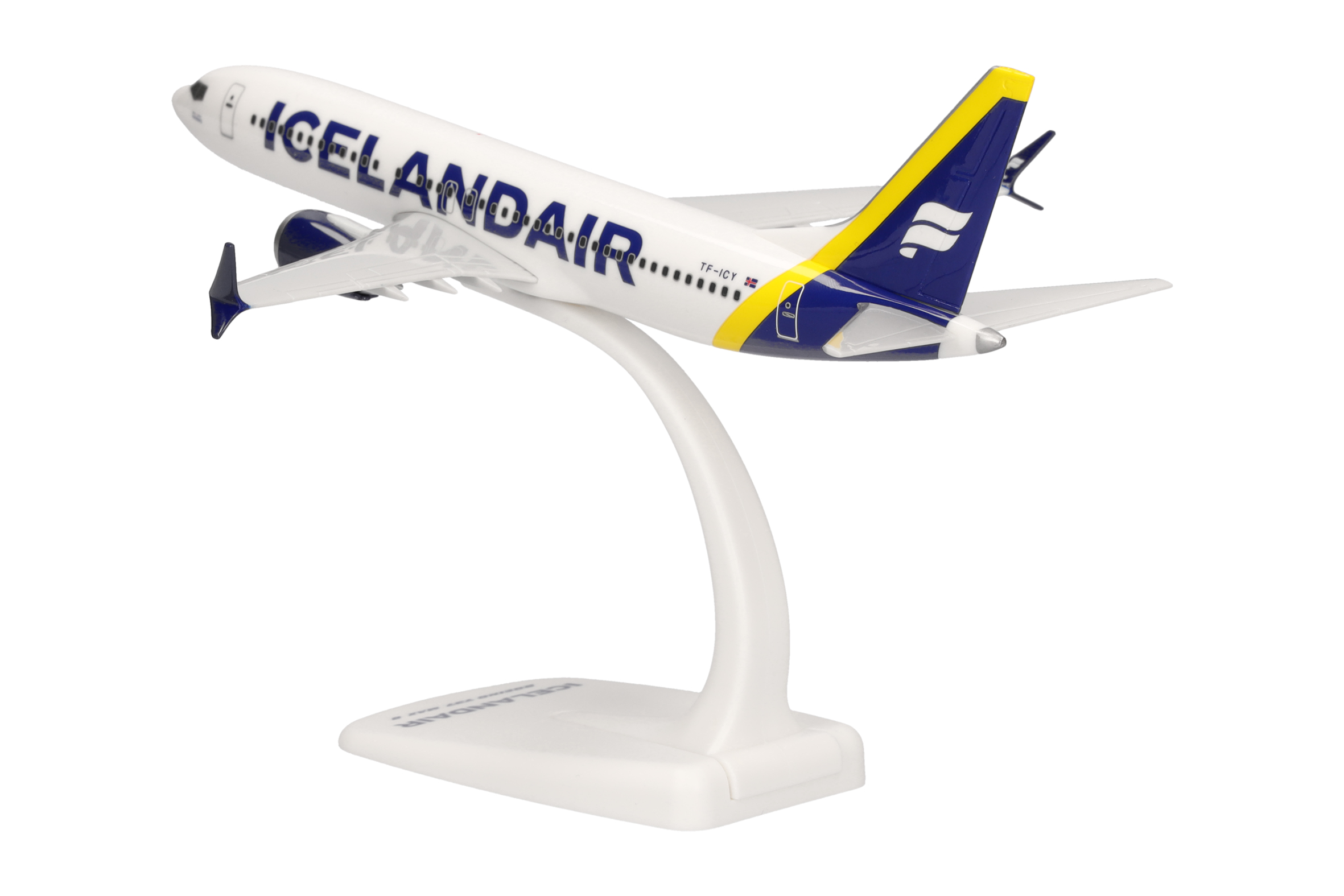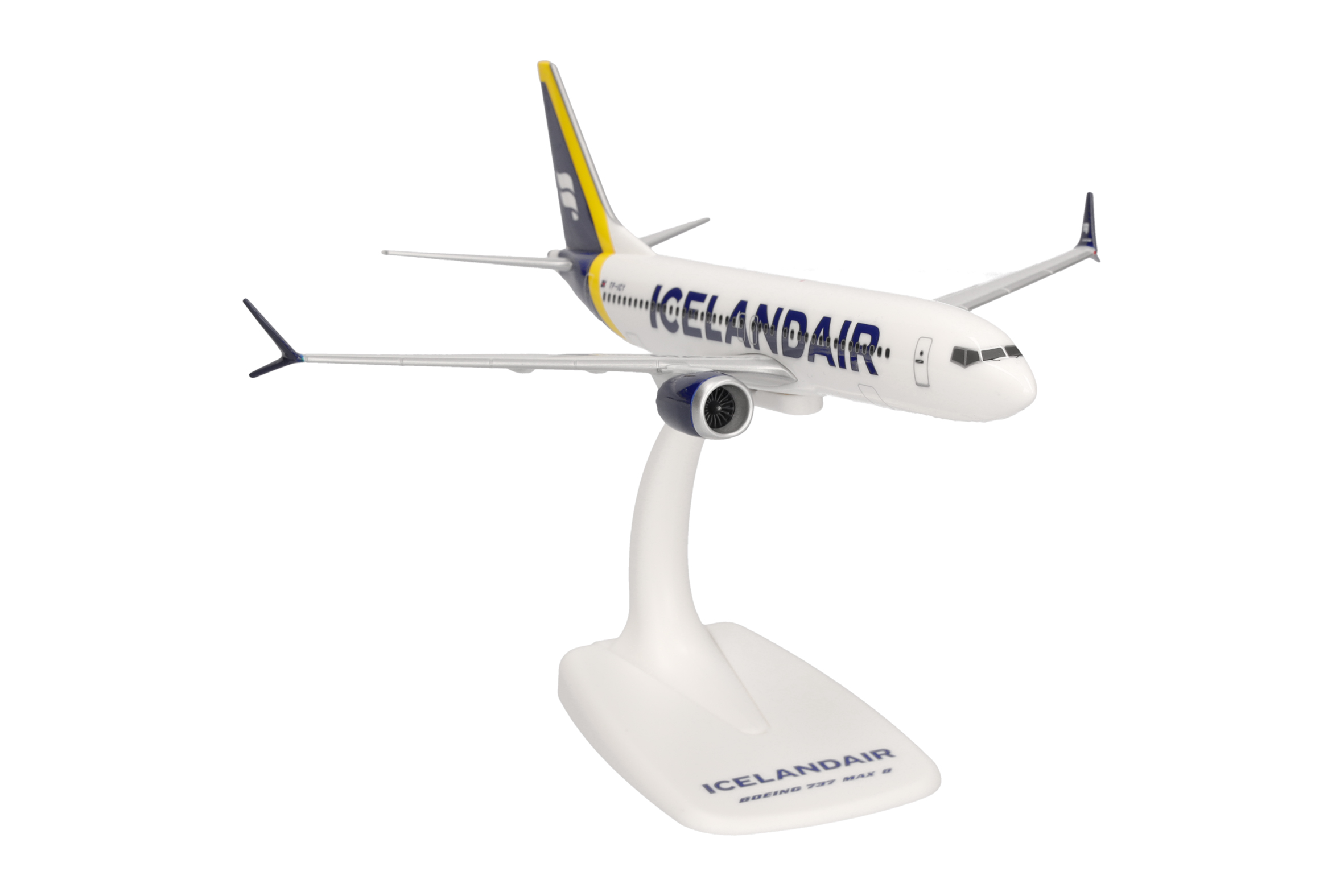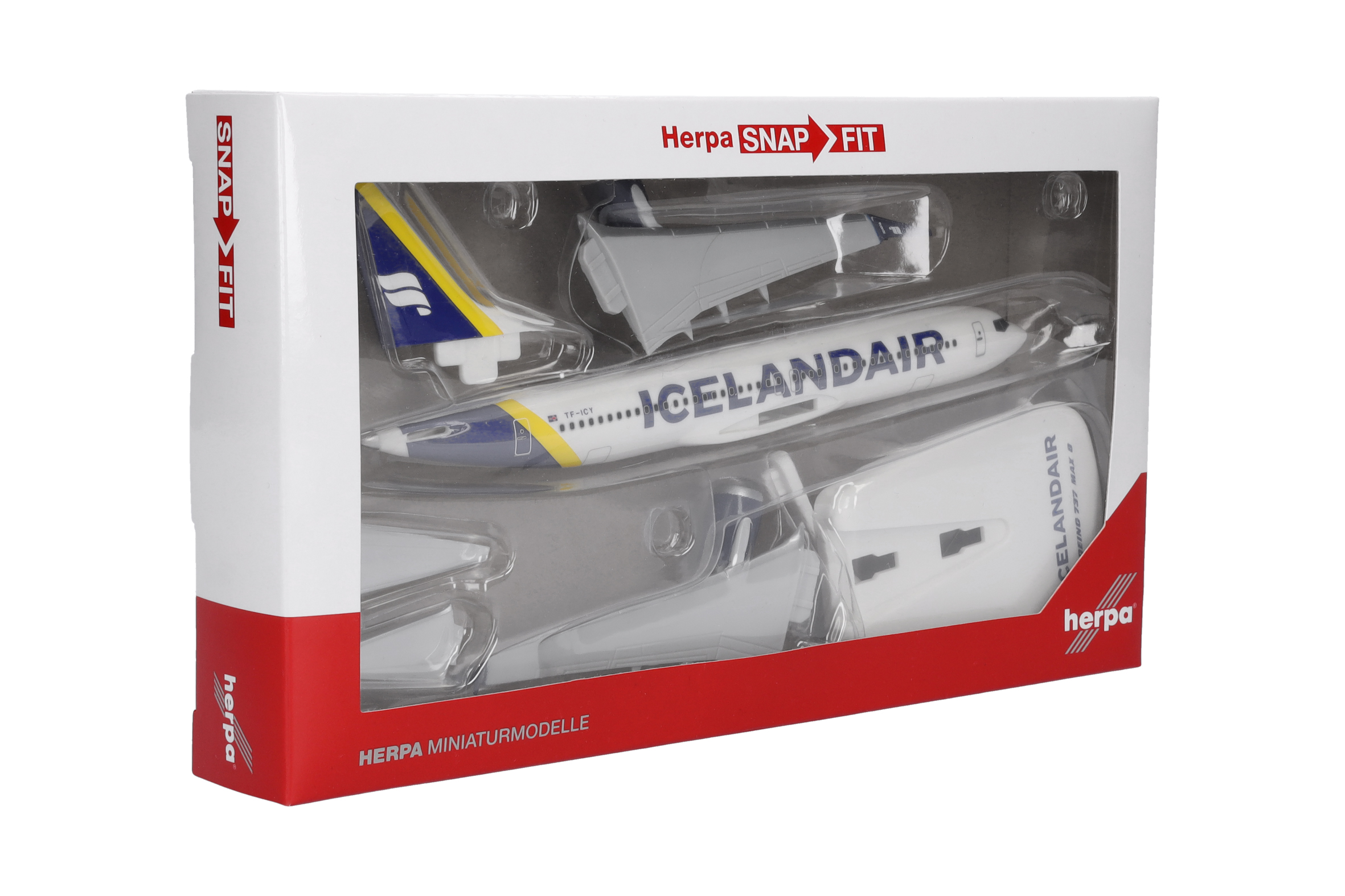 As part of a complete revision of its brand, Icelandair presented a new livery in early 2022. Gone are the blue belly and the yellow engine nacelles. Nevertheless, the new livery adds new colors to the fleet: five variable tail color stripes symbolize different natural phenomena of Iceland. One of the first 737 Max in the new design, and latest release as part of the Herpa SnapFit range, is TF-ICY with a, in this case, yellow stripe on its tail, symbolizing the sunlight being reflected by Iceland’s many waterfalls and glaciers.