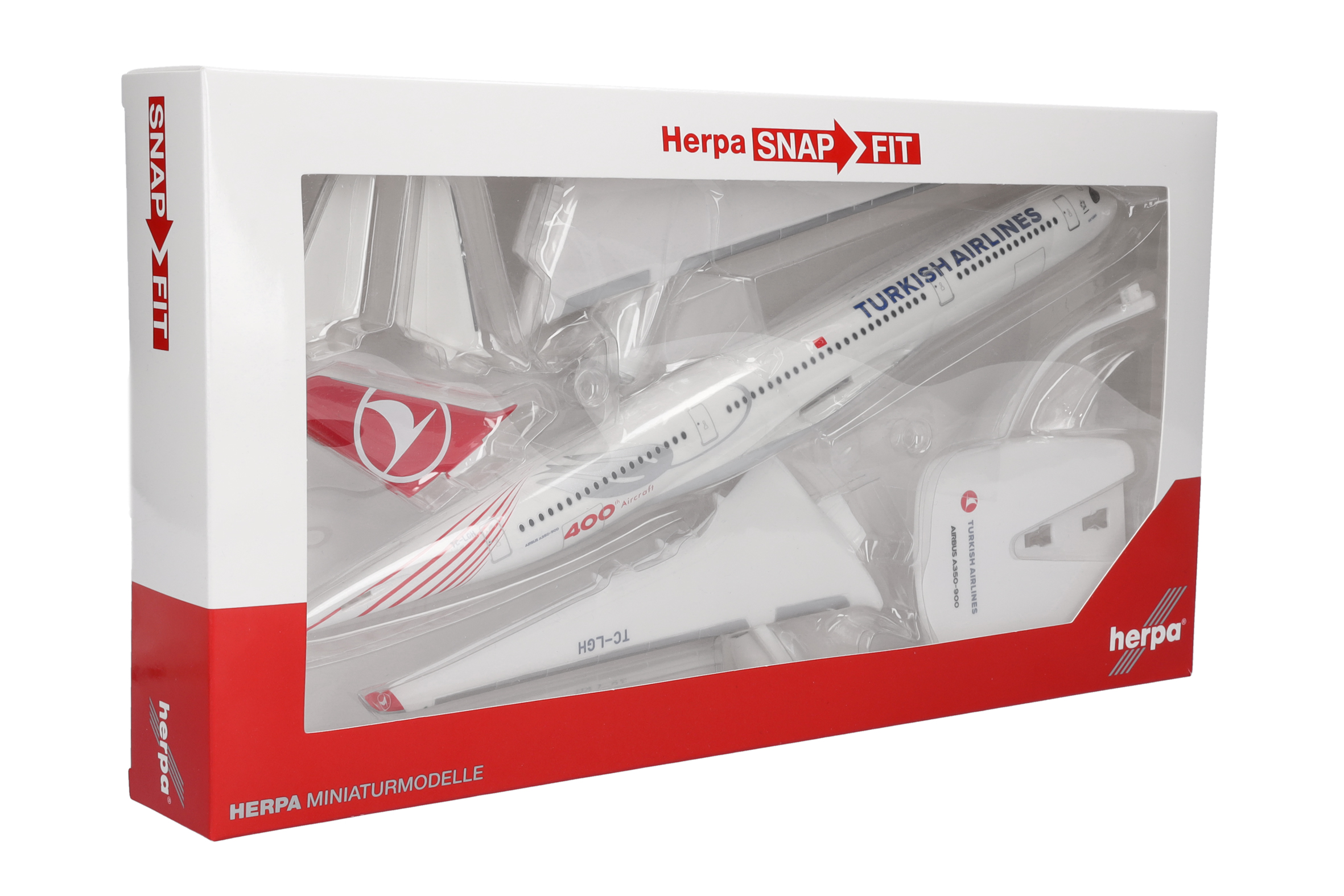 Originally designed for inflight sales, the plastic push-fit models of the Herpa Snap-Fit series shine with an attractive finish and a great value for the money. Snap-Fit models are available in the scales 1:100, 1:200 to 1:250, include an elegant display stand, and can be assembled in no time without a drop of glue.